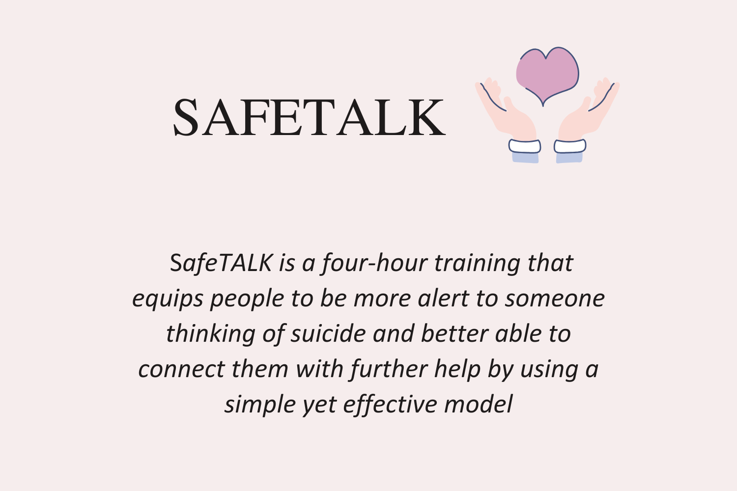 The safeTALK is a half day suicide prevention training course that can help you make a difference.
